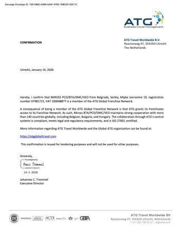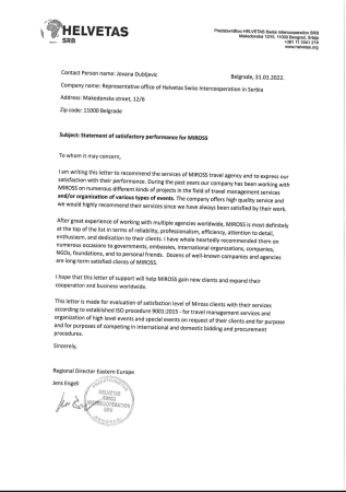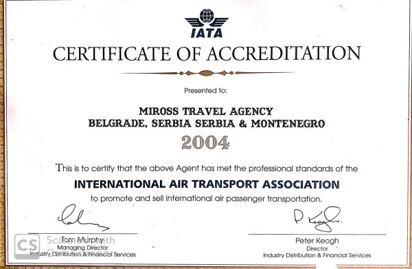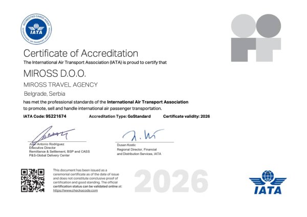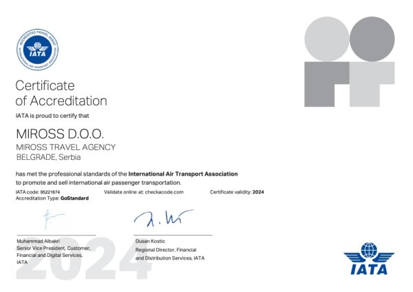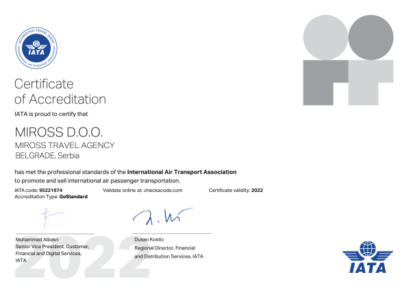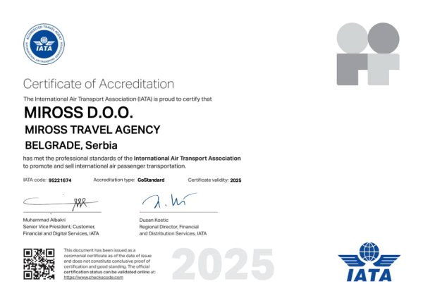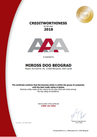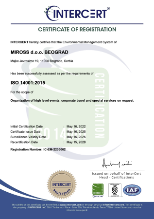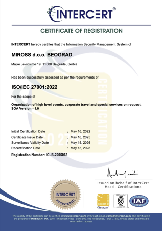 Miross implementira i sertifikovan je ISO 14001:2015, ISO 10002:2014, ISO 9001:2008, ISO 9001:2015, ISO 27001:2013, SecurityMetrics sertifikatima, akreditovan od strane IATA i ICCA.
